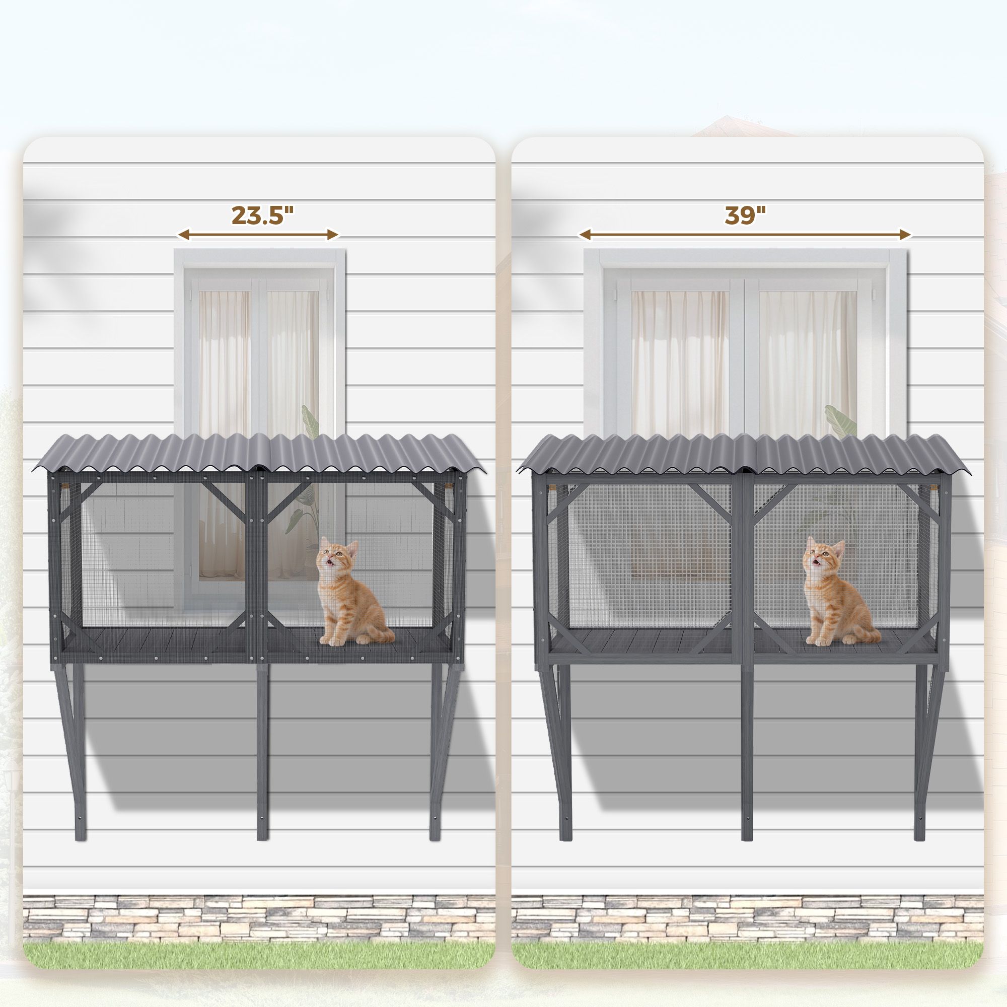 - [Spacious Multi-Cat Enclosure]Measuring 43.3" × 25.2" × 47.2", this spacious outdoor cat house comfortably fits 1 to 4 cats—perfect for lounging, playing, or napping in a secure and cozy environment.