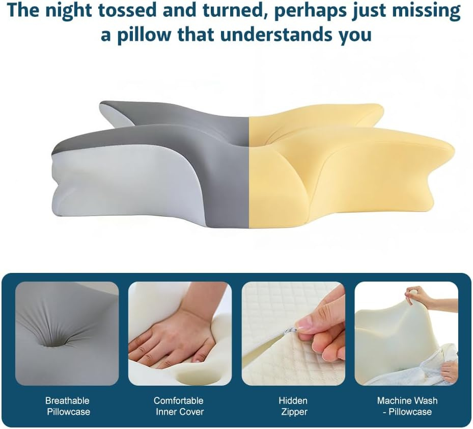WAKE UP REFRESHED, SLEEP WITHOUT PAIN! Ergonomic Bow Design follows the natural contours of your shoulders, providing customized support that eliminates pressure points. whether you’re a side, back or stomach sleeper.The 15° Precision-Angled Concave Center works like a personal sleep therapist, gently supporting your head while maintaining optimal neck curvature and spinal alignment. Wake up feeling truly refreshed, without the aches and pains.WHY COMPROMISE ON REST? Our pillow delivers unparalleled comfort: it conforms precisely to your curves, offering cloud-like support that doesn’t let you sink too far, all while staying remarkably breathable and temperature-neutral. Wake up feeling refreshed, cool, and perfectly supported, night after night.REVOLUTIONARY 5-ZONE SLEEP TECHNOLOGY! Our Cervical Pillow engineered with five precision support zones to cradle every curve of your body. The hollow-core butterfly design adapts dynamically to your sleeping position while the extended armrest platform gives your arms the freedom they crave. Experience the hug-like comfort of our widened side supports – your new favorite sleeping position awaits!SMART DUAL HEIGHT CERVICAL CERVICAL PILLOW Two Expert-Designed Heights in One Pillow: 5.1" Gentle Support – Perfect for back/stomach sleepers who need natural neck alignment 5.9" Enhanced Support – Ideal for side sleepers requiring deeper contouring Why This Changes Everything: Clinically-Designed Heights based on 20+ years of orthopedic research Medical-Grade Memory Foam that remembers your shape while providing perfect resistance Universal Sleep Solution – Finally one pillow that works for ALL positions Eliminates Midnight Adjustments with just-right support all night long