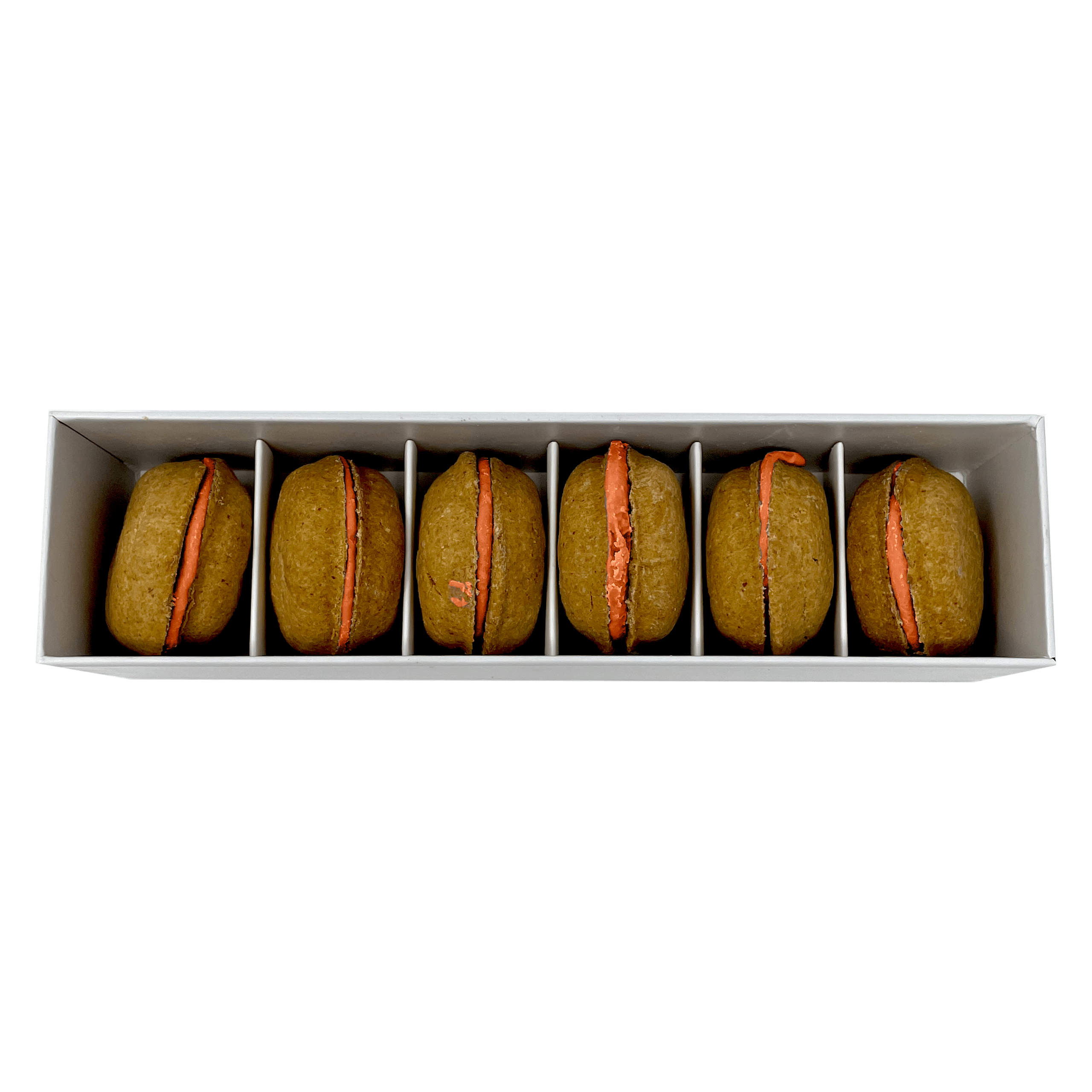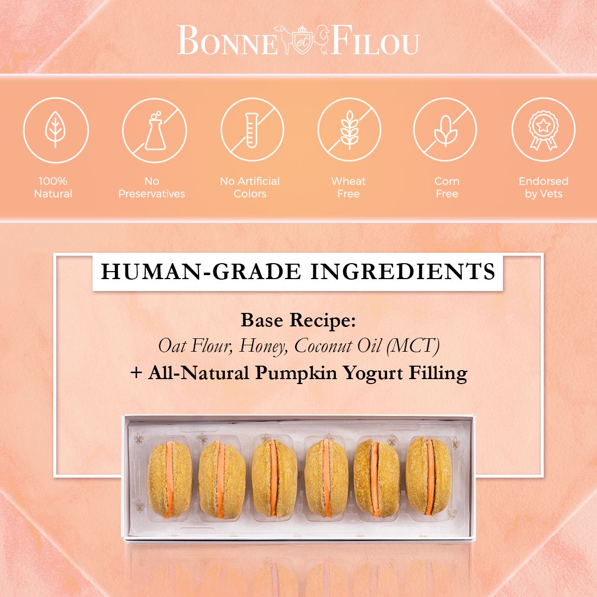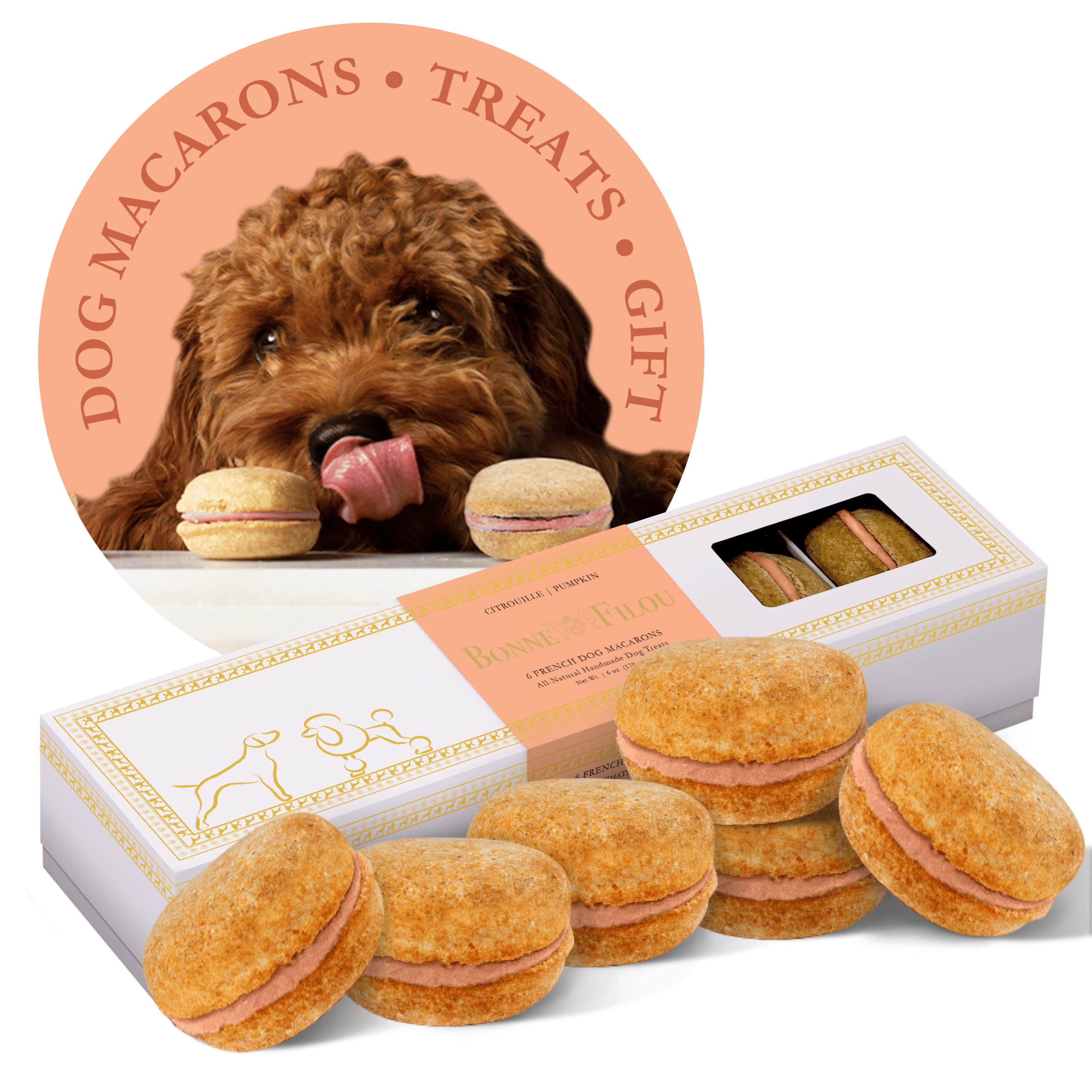 Dog Macarons – Count of 6 (Dog Treats | Dog Gifts)This box of our premium macaron treats features: – Box of 6 dog macarons- Handmade with premium human-grade ingredients in the USA- 100% natural; corn-free; wheat-free ingredients- No artificial coloring or preservatives- Hard treat designed for a long-lasting chew- Shelf life of 18+ months | No need for refrigerationBase Recipe Ingredients: Oat Flour; Honey; Coconut Oil; All-Natural Flavored Yogurt FillingFeeding Instructions:Our treats are hard; designed for a long-lasting chew. For elderly or small dogs; we recommend breaking the treat in smaller pieces (by twisting both sides).