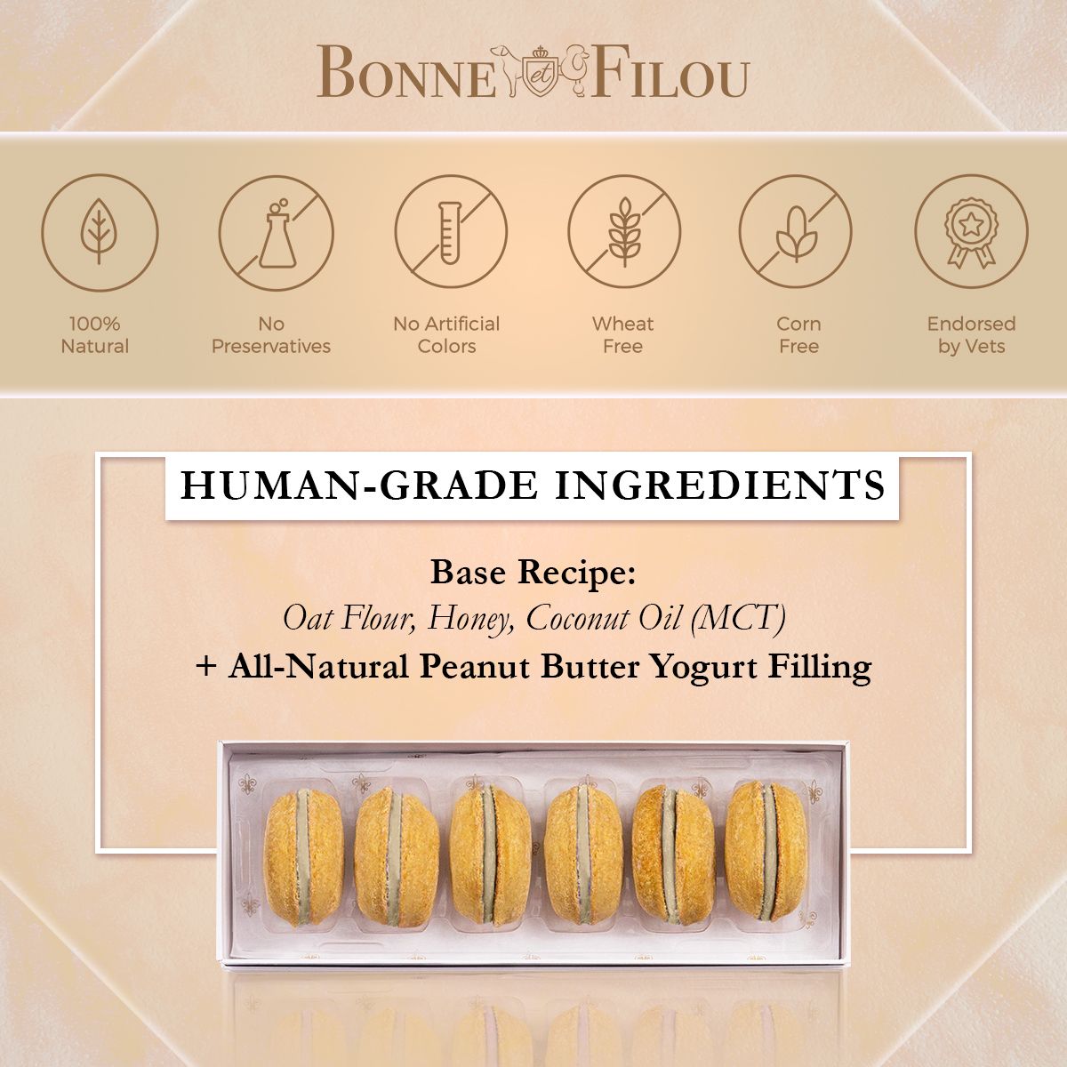 Dog Macarons – Count of 6 (Dog Treats | Dog Gifts)This box of our premium macaron treats features: – Box of 6 dog macarons- Handmade with premium human-grade ingredients in the USA- 100% natural; corn-free; wheat-free ingredients- No artificial coloring or preservatives- Hard treat designed for a long-lasting chew- Shelf life of 18+ months | No need for refrigerationBase Recipe Ingredients: Oat Flour; Honey; Coconut Oil; All-Natural Flavored Yogurt FillingFeeding Instructions:Our treats are hard; designed for a long-lasting chew. For elderly or small dogs; we recommend breaking the treat in smaller pieces (by twisting both sides).