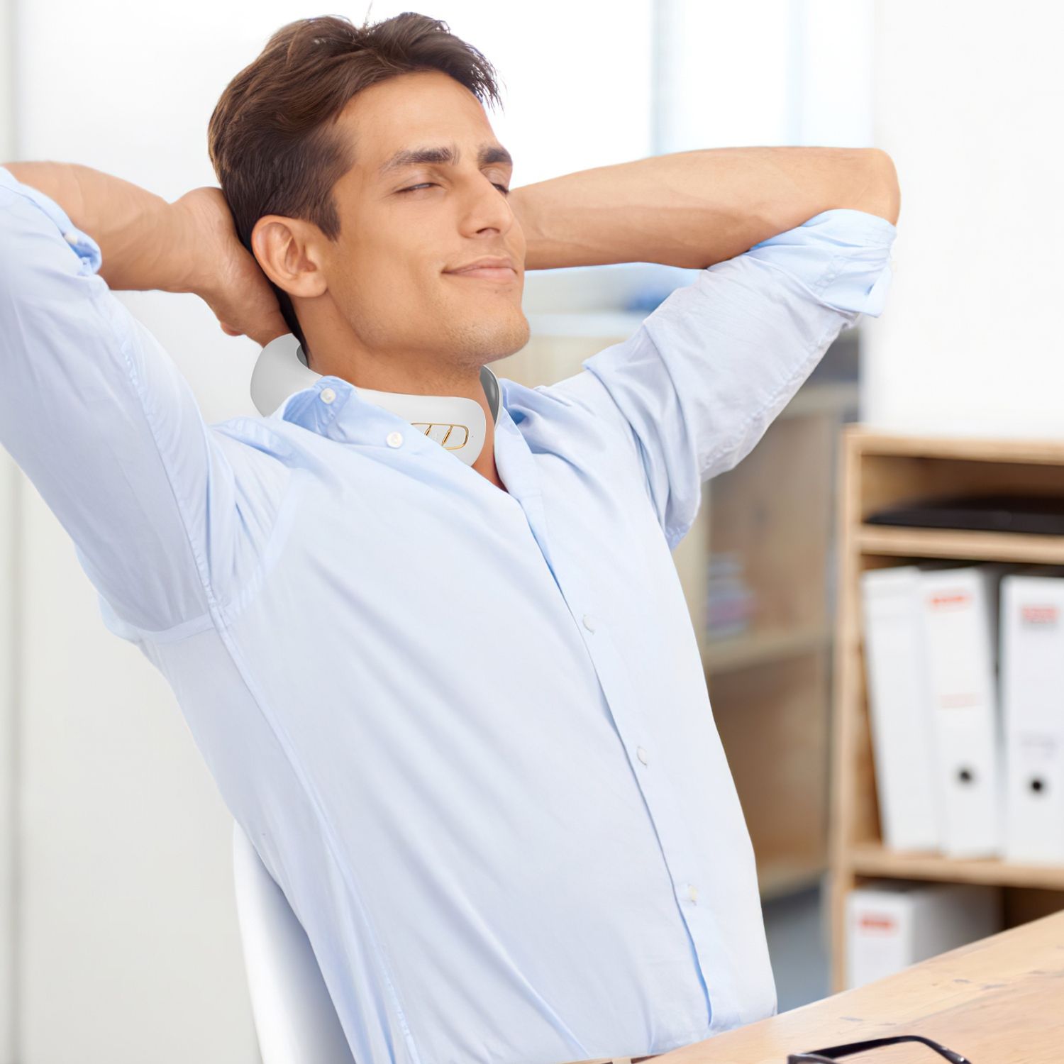 * Place the massager around your neck, aligning the electrode plates with your neck muscles. Adjust for a comfortable fit.