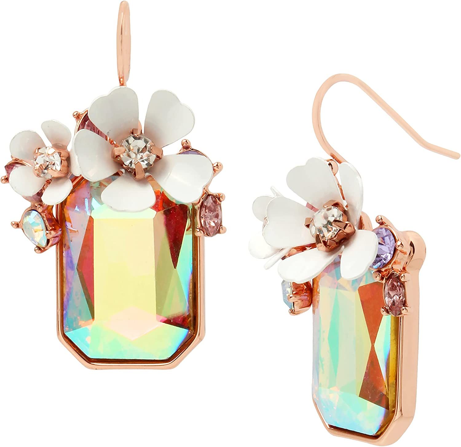 Drop earrings featuring iridescent rectangle-shaped stone embellished with flower and mixed stone cluster. Earrings are set in rose gold-tone metal with a fish hook closure.