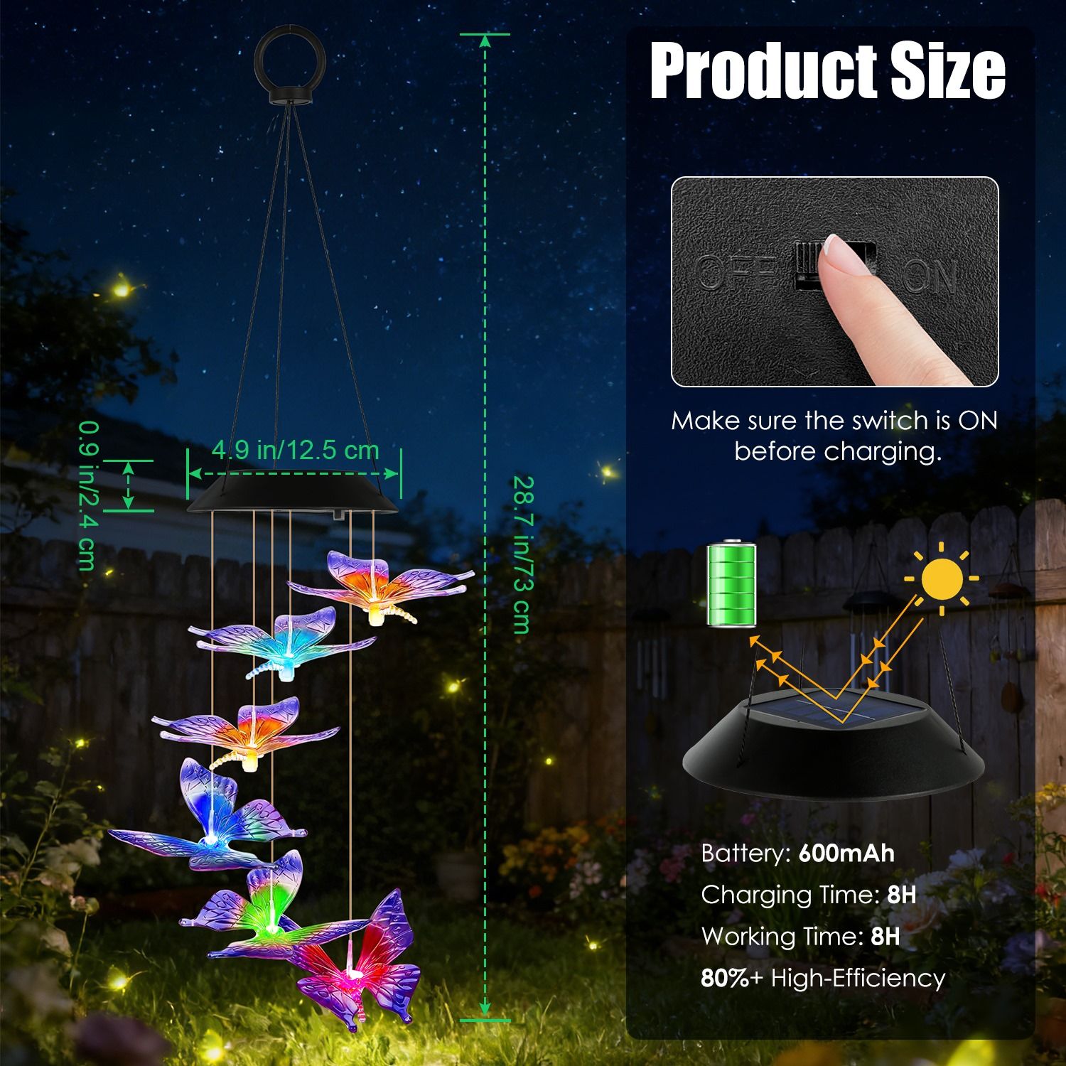 Elegant Outdoor & Indoor Decoration: Easy to hang. Beautiful even during the day, this butterfly solar wind chime adds artistic charm and refined elegance to gardens, lawns, balconies, patios, windows, and home interiors.