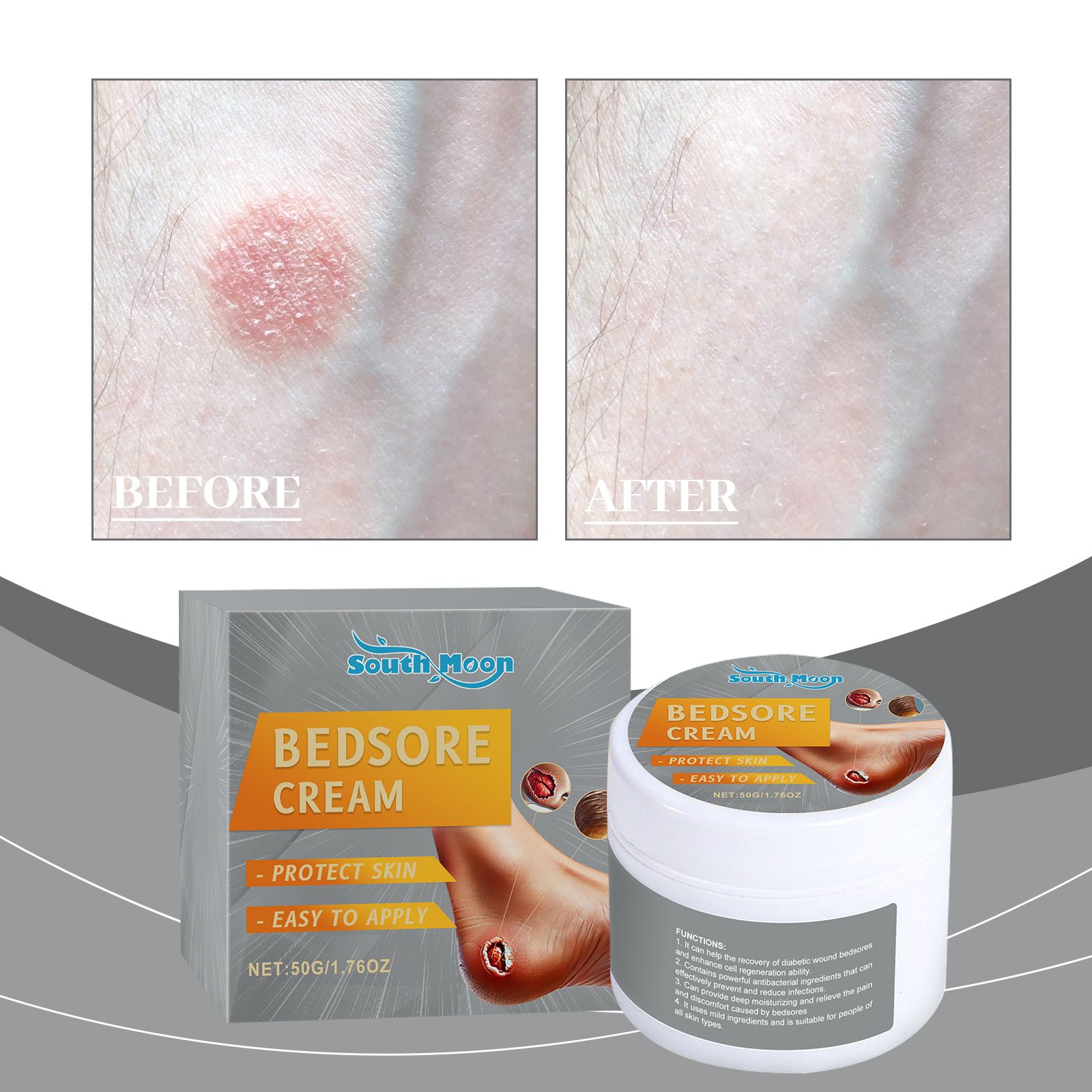 Our skin care cream contains comfrey extract and sophora flower extract. It can and discomfort and make the user feel more comfortable. Its use method is very simple: thoroughly clean the skin, dry first, take appropriate amount of this product, evenly apply to the ankles, high heels, buttocks, ears and other parts of the where bedsores occur, gently massage to complete absorption. It can also recovery and the risk of bedsores spreading.